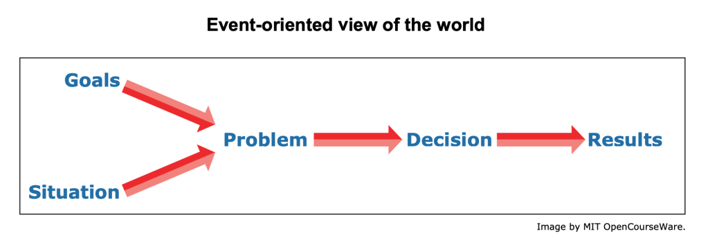 We need to start with our current mental models that usually frame problems as linear cause and effect. This event-oriented view of the world is helpful in that it helps us keeping moving the ball by operating in discrete problem-solution steps (after all, it is much easier to fund projects that promise a clear solution to a clear problem in a pre-specified time). And usually, reality doesn’t play out in such a simplistic, linear fashion: